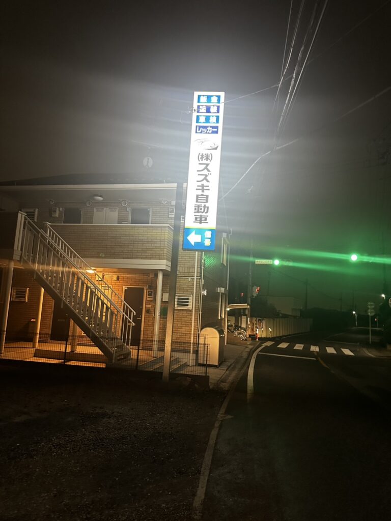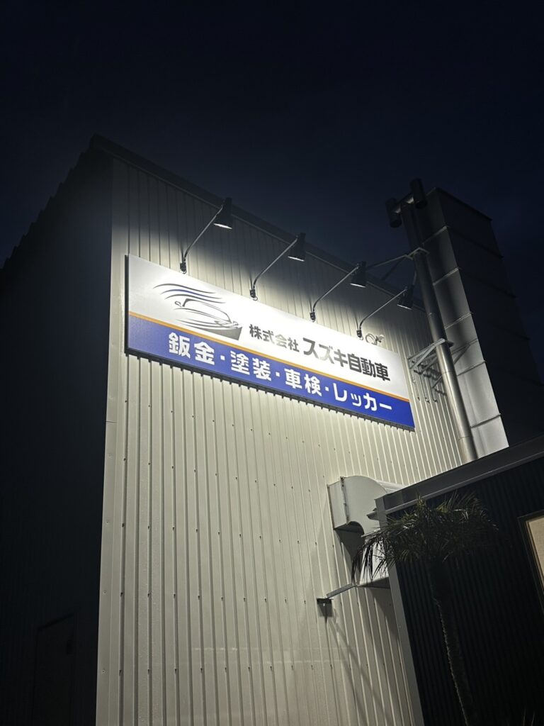 弊社の新しい看板に夜間でもはっきり見えるようLEDライトが付きました。